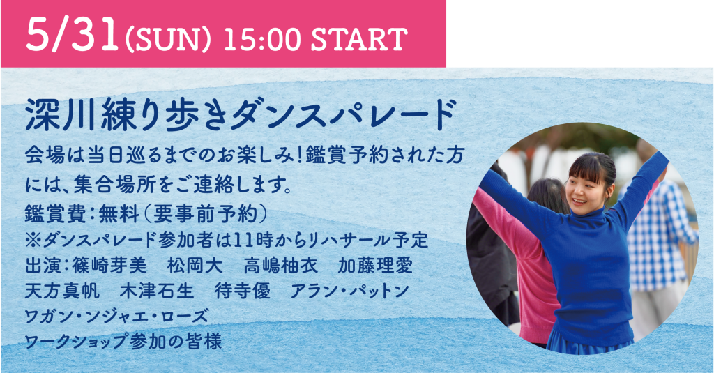 May 31(SUN) 15:00 Start Fukagawa Dance Parade The venue will be revealed on the day—part of the fun! Those who have reserved for viewing will be informed of the meeting point in advance. Admission: Free (advance reservation required) Parade participants are scheduled to rehearse from 11:00.