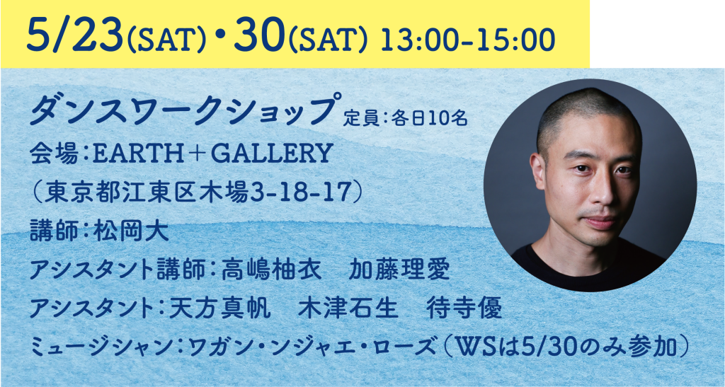 May 23(SAT) & 30(SAT)13:00 – 15:00 Dance Workshop Venue: EARTH+GALLERY Address: 3-18-17 Kiba Koto-ku Tokyo Facilitator: Dai Matsuoka Assistant Facilitator: Yui Takashima, Rie Kato Assistant: Maho Amakata, Issei Kizu, Reona Hirai, Yu Machitera Musician: Wagane Ndiaye Rose(only May 30) In this workshop led by Dai Matsuoka, we will create and enjoy a dance together for the dance parade on May 31! People with disabilities, beginners, and families are all warmly welcome to join! Capacity: 10 participants per day